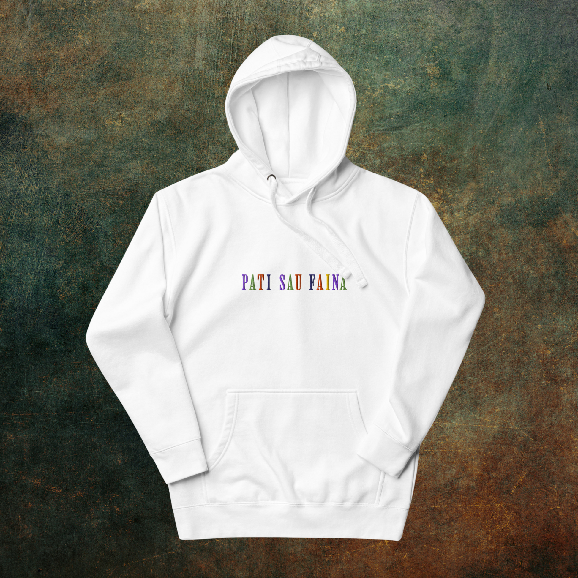 PATI SAU FAINA siuvinėtas džemperis su gobtuvu – subtilus, bet labai aiškus pranešimas visiems. Spalvingas siuvinėjimas ant minimalistinio balto ar juodo džemperio suteikia išskirtinumo ir humoro.